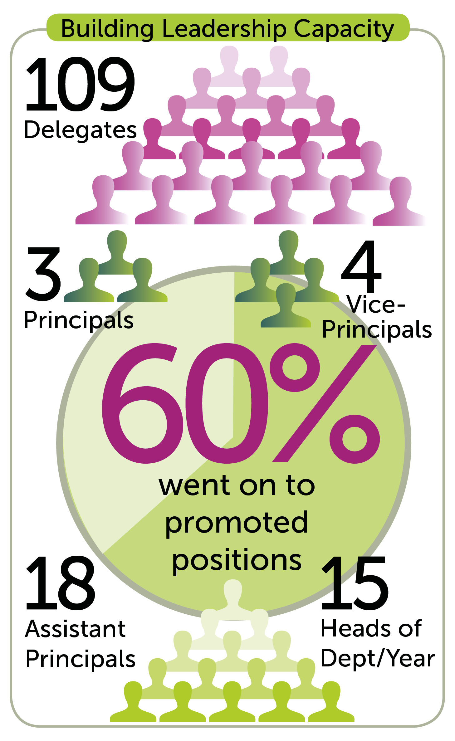 Of the 109 delegates on the programmes, almost 60% went on to promoted positions, including three Principals; four Vice Principals; 18 Assistant Principals; and 15 Heads of Department or Year. Indeed, Paul explained that ‘one of the reasons the programme is so exciting is that no matter your position, the programme can deepen your thinking and facilitate change’. He recalled a time when a group included a long-standing Vice Principal and an aspiring Head of Department, discussing what outstanding delegation looks like and causing them to reflect on their own leadership behaviour in the process.” - More collaborative and reflective leaders
